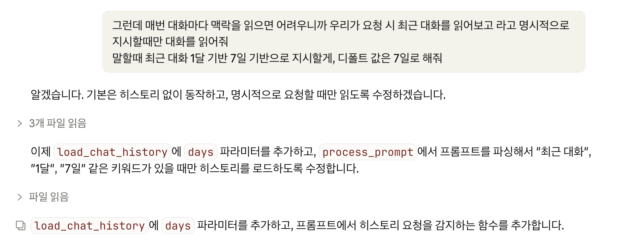 /c 최근 대화 기반으로 요약해줘→ 7일치 로드 (기본값)/c 1달 대화 기록 보고 정리해줘→ 30일치 로드/c 3일 대화 내용 알려줘→ 3일치 로드/c 오늘 날씨 어때?→ 히스토리 없이 바로 응답