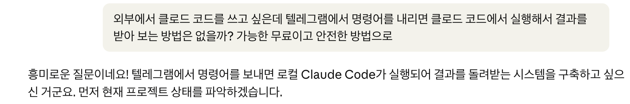 외부에서는 클로드 코드 실행을 못하는데 텔레그램이랑 연동하면 되겠구나!