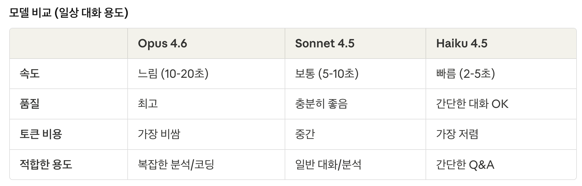 일상 용도로는 Sonnet 4.5 가 적당합니다.