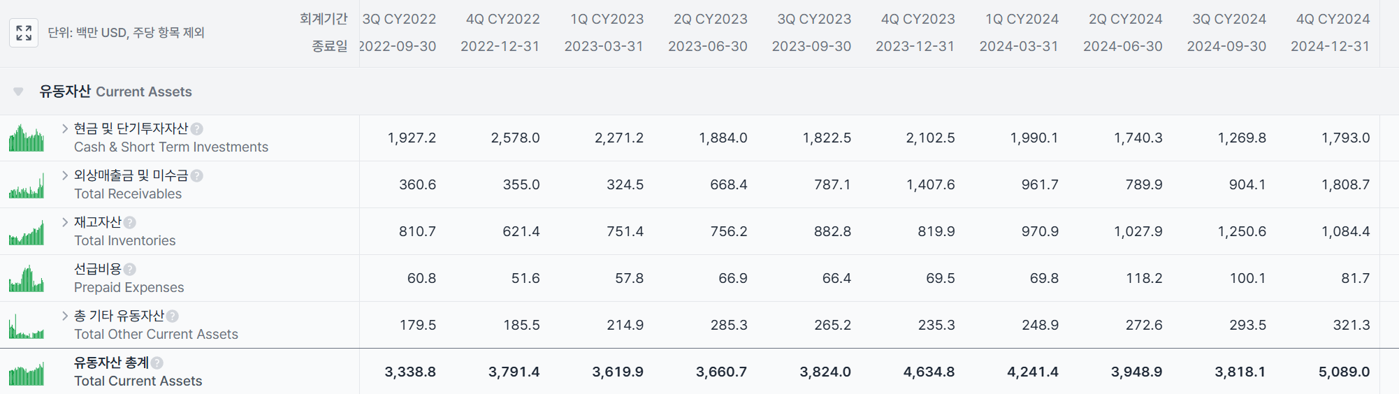 또한 재고자산도 증가하고 있는데 이는 2022년 23년 24년 매출이 증가함에 따라 증가한 것이라 신경쓰지 않아도 될 것 같습니다.