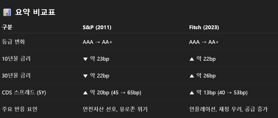 2011년을 보면 국채금리가 하락하였지만 2023년을 보면 국채금리가 상승하였고 CDS 스프레드는 2011년에 20bp 2023년에 13bp 상승하였음을 알 수 있다. 2011년 국채금리 하락은 유로존 위기라는 특수한 상황으로 인한것이라 생각하면 시장은 대체로 등급하락 -> 신용위험 상승, 국채금리 상승이라 ...