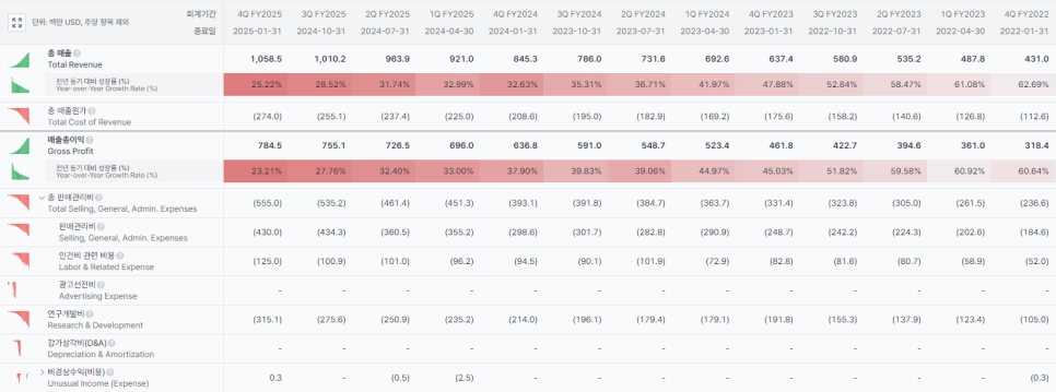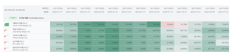 24년 7월 이후 매출 성장률 YOY 기준 30%에서 25%까지 급격히 하락. 24년 7월 여파로 고객의 계약 확보 속도가 여전히 지연되고 있으며, 가이던스에서 25년 하반기에 개선된다고 했으니 하반기 결과때 다시 확인 필요