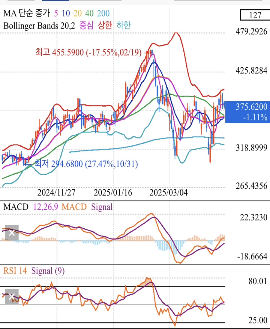 - RSI도 실적발표때 30이하로 떨어지며 298 최저가를 찍었으나 그때가 저점매수하기 좋았으며 현재는 50 위아래에서 유지