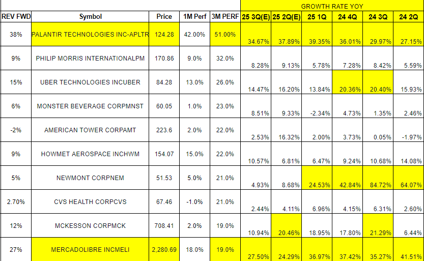 : 작년까지는 반도체, AI SAAS, 인프라 기업이 주를 이었다면, 올해는 큰 조정이 오고난 후로 3M PERFORMANCE가 좋은 기업들이 딱히 쏠림이 없다. PALNTIR 제..