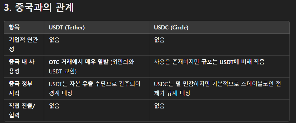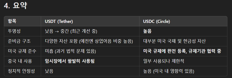 아래에 테더(USDT)와 USD코인(USDC)의 준비금 구조, 투명성, 그리고 미국/중국과의 관계를 비교 정리해드릴게요.