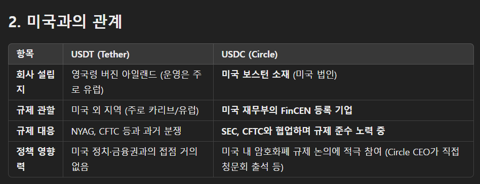 USDC는 Circle과 Coinbase가 공동으로 만든 코인이며, 미국 내 스테이블코인 규제 논의에서 Circle은 “합법적이고 투명한 스테이블코인”의 대표주자로 불립니다.