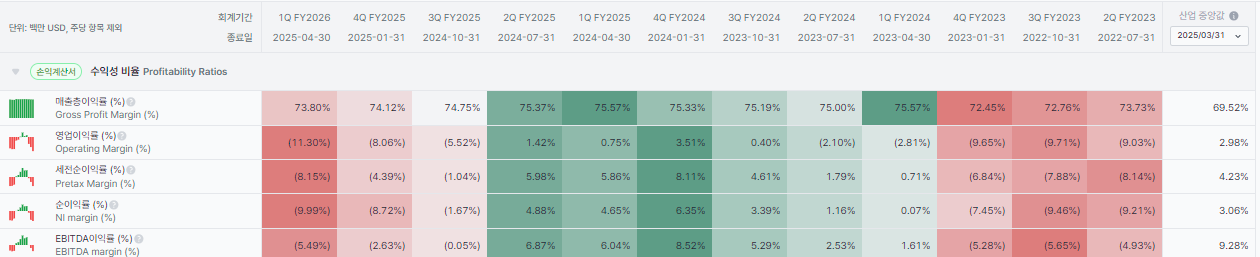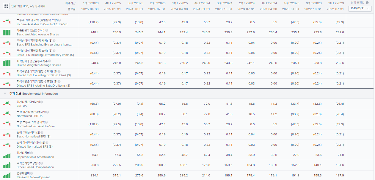 주식보상 및 연구개발비가 많이 드는 것으로 보아 매출이 커지는 것에 비례하여 치열하게 경쟁하고 있는 것으로 보입니다. 마진을 크게 남기고 있지도 않는 성장형 종목의 전형적인 모습은 좋긴 합니다만...