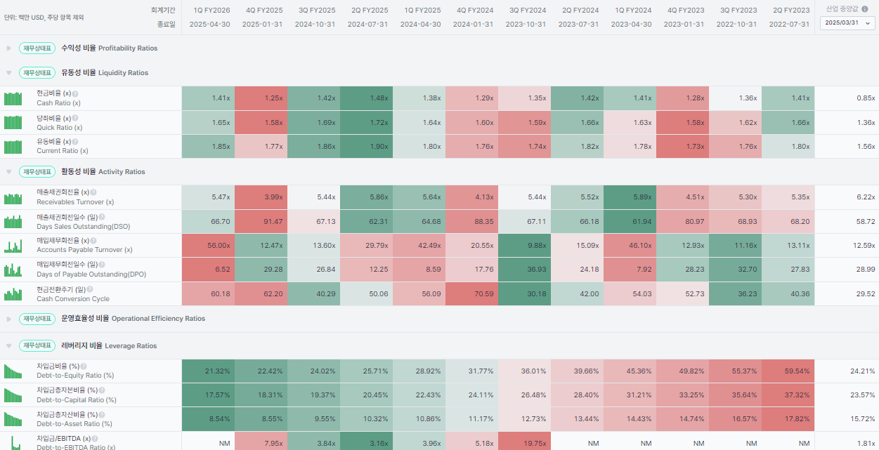 수익성, 유동성 모두 산업평균보다 훌륭하네요. 특이사항은 없어 보입니다.