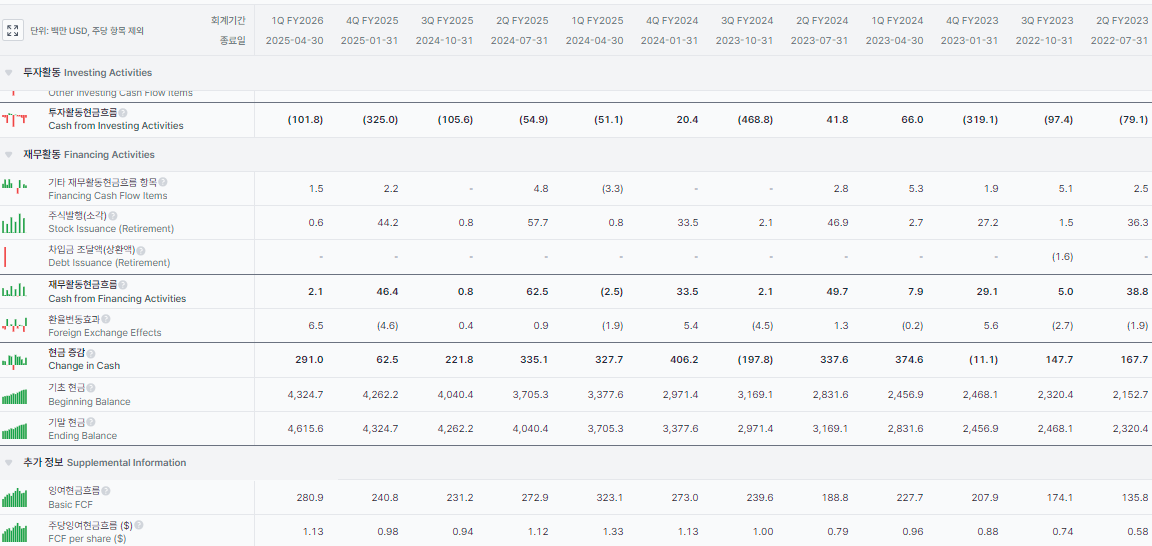매출이 커지는 것에 비해 FCF도 성장하지 못하는 점은 아쉽지만, 그래도 잘 유지는 하고 있네요.