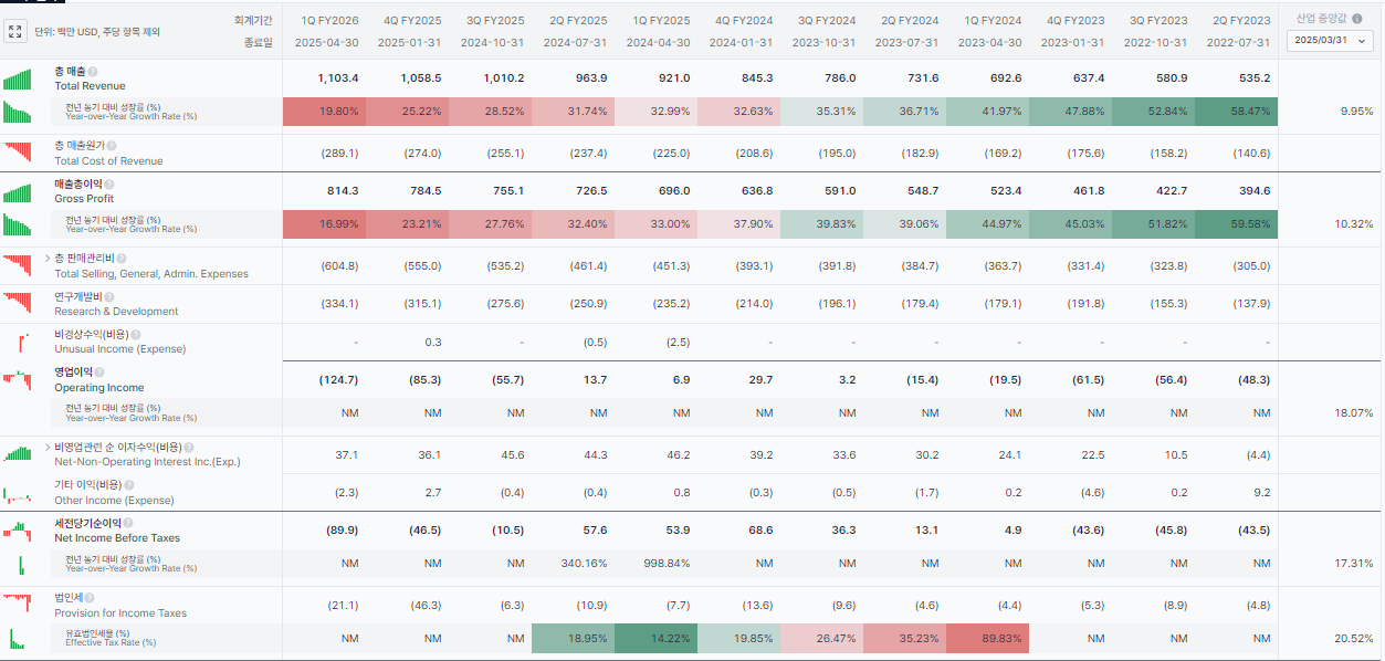2026 회계연도 2분기 총 매출은 11억 4,470만 달러에서 11억 5,160만 달러 범위 예상(전년 대비 19% 성장)