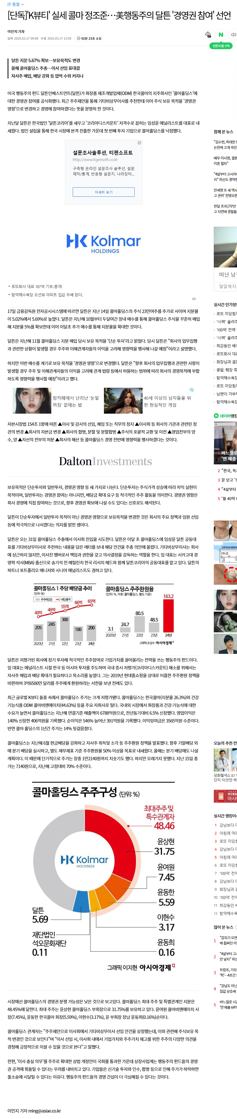 • 콜마홀딩스에 대한 달튼의 지분 : 5.69%