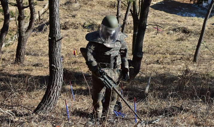 [더럽게 무거웠던 지뢰방호복과 PRS-17K 탐지기. 한 5분하면 팔이 떨어져 나갈 것 같았다]