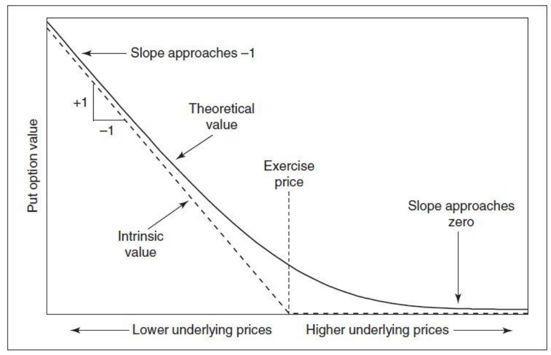 옵션의 가치는 만기시점에 정확히 내재 가치로 수렴한다. 그러나 만기 이전에 옵션의 이론적 가치는 내재 가치에 접근하는 곡선이다. [그림 7-4]에서 보여지는 것과 같이 옵션이 매우 내가격이 되거나 매우 외가격이 될 때에는 내재 가치에 근접한다. 기초 자산 가격이 상승함에 따라, 그래프의 기울기는 +1에 근접하고, 기초 자산 가격이 하락함에 따라, 그래프의 기울기는 0에 근접한다. 콜 옵션의 델타는 주어진 기초 자산 가격에서 그래프의 기울기, 즉 기초 계약의 움직임에 따른 옵션 가치의 변화율이다.