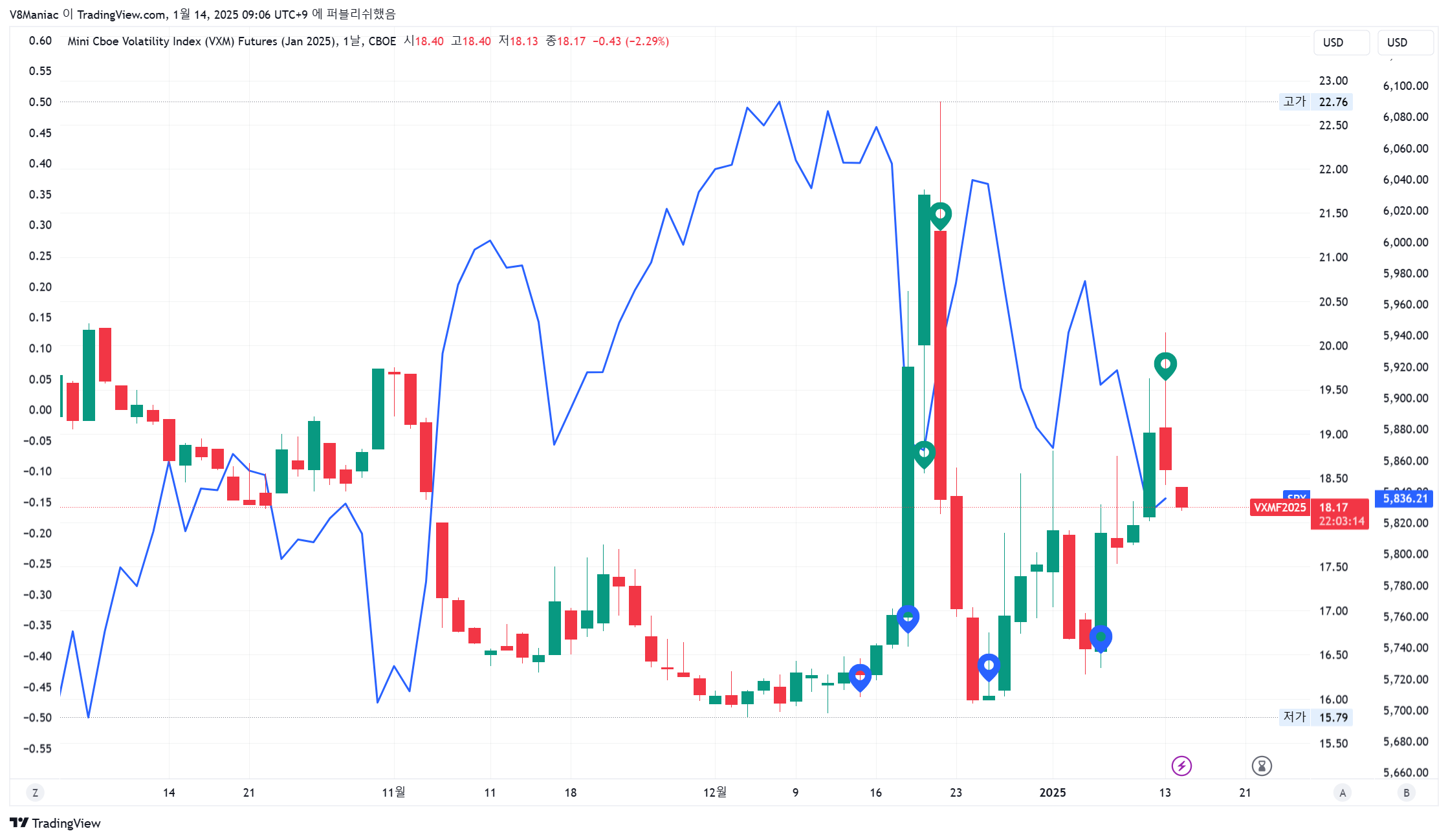 [미니 VIX 1월물 (캔들차트), S&P500 (파란선)]