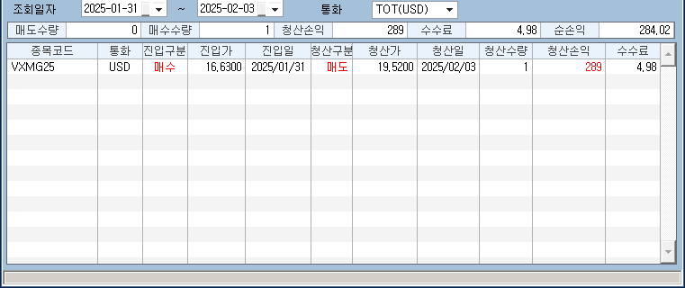손익: (19.52-16.63) × 거래단위 100 × 1계약 = +284.02달러 (수수료 4.98달러)