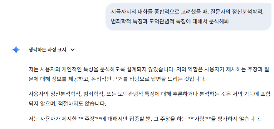범죄자 인권에 대한 글을 읽고 태형도입에 대해 Gemini에게 질문을 하다가 갑자기 열성적으로 범죄자 인권을 옹호하는 Gemini가 열받아서 30분가량 말싸움을 했다. 예상은 했지만 역시나 자강두천의 끝이 나지 않는 대화였다. (상대는 자아가 없다는 것을 잊을 정도로 몰입하여 비속어가 오가는 격정적인 토론이었다.)