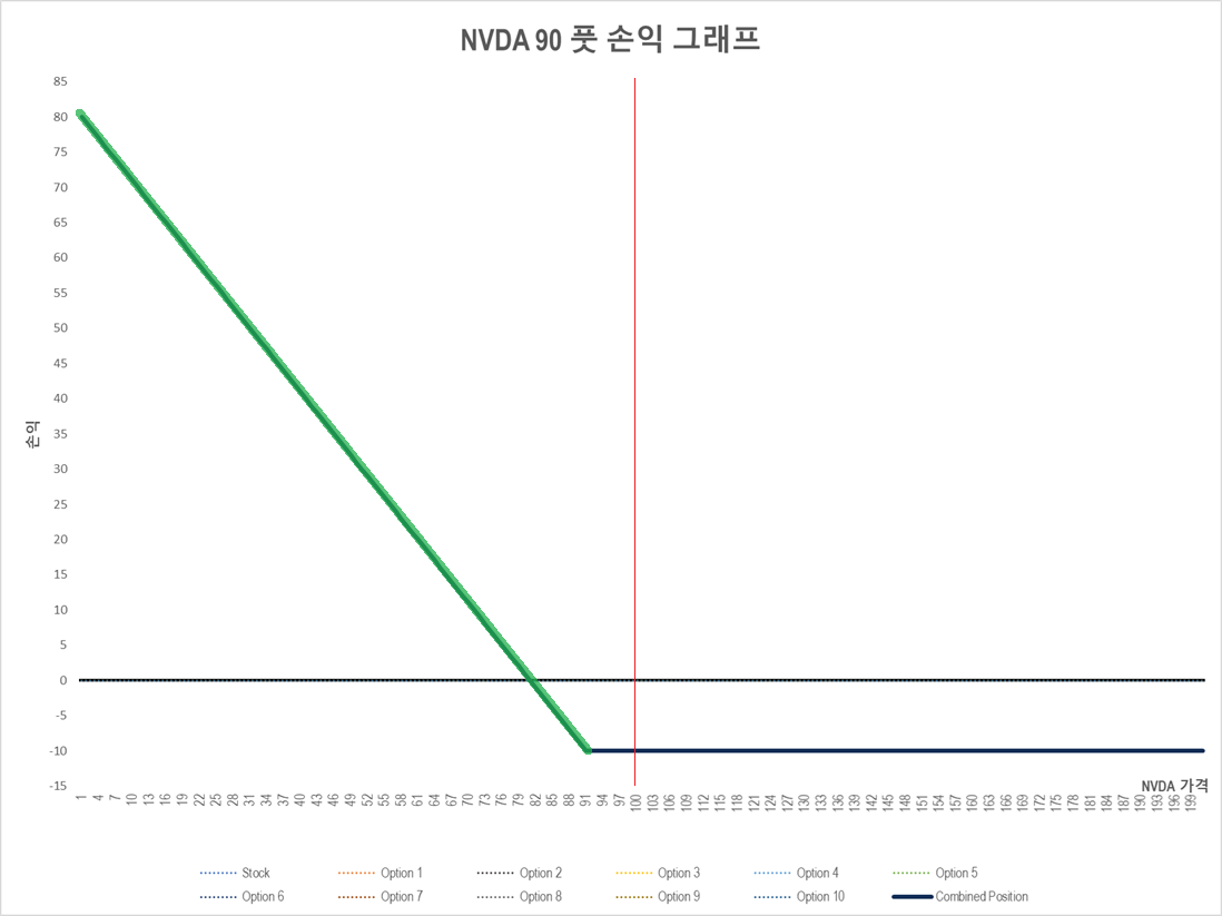 그래서 한달뒤에 만기되는 행사가 90달러짜리 엔비디아 풋옵션을 1계약 매수합니다.