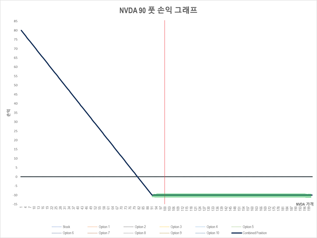 초록색 형광펜 표시를 보시면, 엔비디아가 100달러 이상의 구간에서는 선이 가로로 꺾여있습니다. 이게 무슨말일까요? 내 예상이 틀려서 엔비디아 가격이 100달러 이상으로 아무리 올라가도, 내 손실은 늘어나지 않는다는 것입니다. 그래프가 아래로 안내려가니까요.