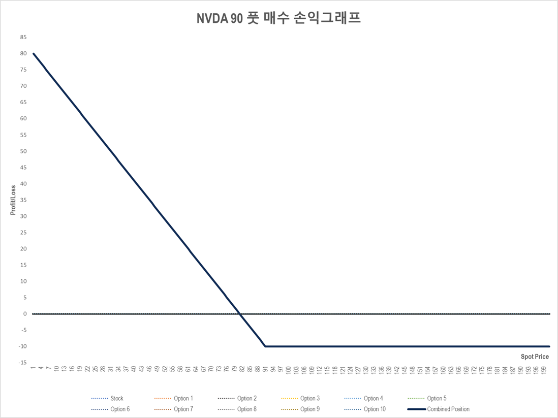 풋은 이렇게 왼손을 드는 모양의 손익그래프를 지닌다고 했죠.