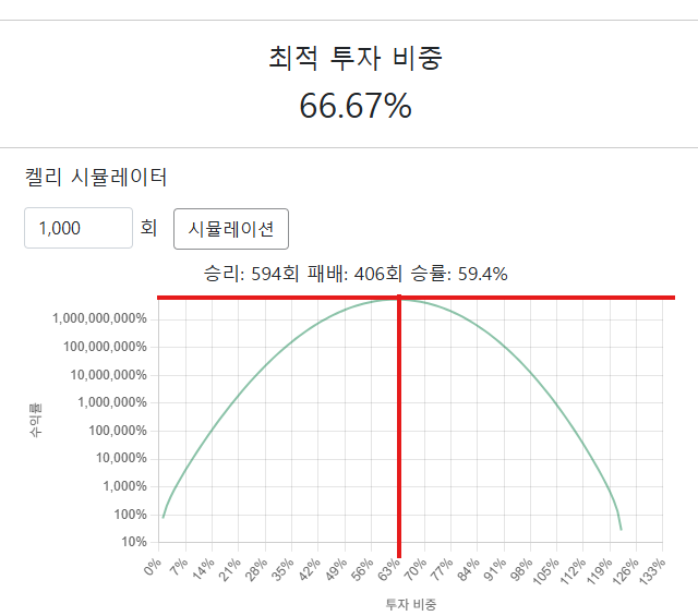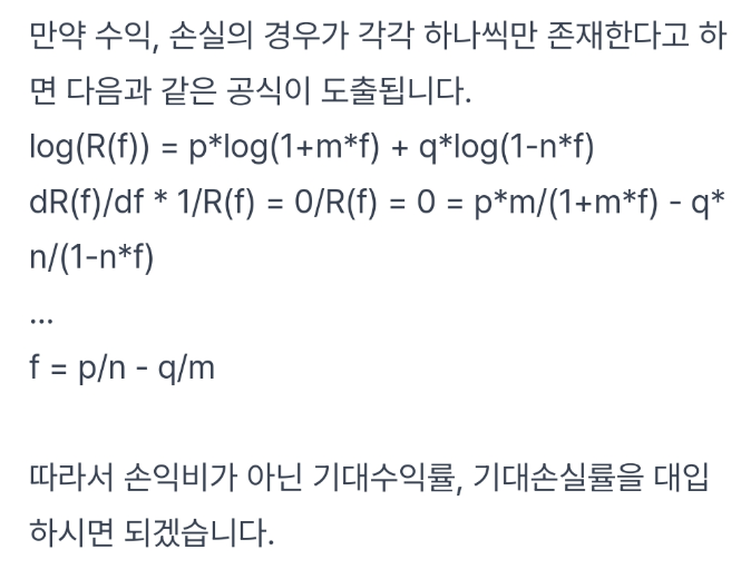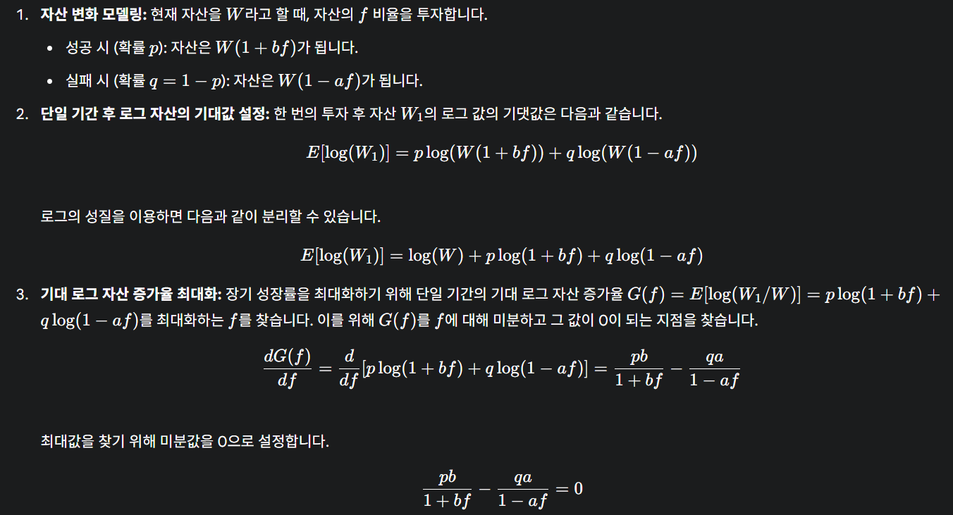 즉, 무수히 많은 시행을 반복했을 때 달성할 수 있는 장기적인 자산 성장 경로 상에서 수익률이 이론적으로 최적화되는 지점의 투자 비중을 계산하는 것이라 이해할 수 있습니다.