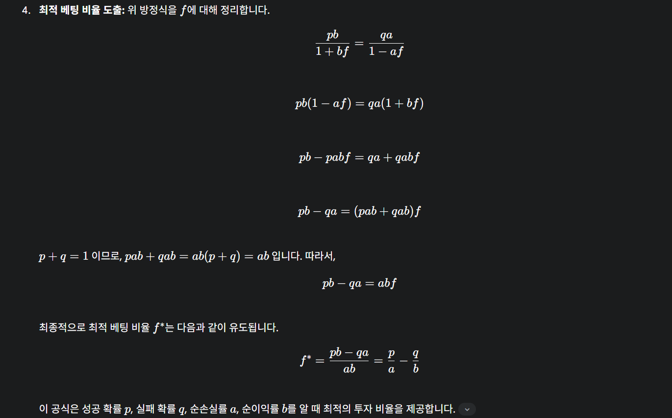 그러나 만약 개인이 투자에서 '감당 가능한 최대 손실' 규모를 사전에 명확히 정의한다면 어떨까요? 이 '감당 가능한 손실 규모'를 켈리 공식의 '단위 손실'(이론상의 a)로 간주하고 공식을 적용한다면, 무한 반복 시행 시 이론적으로 이 '감당 가능한 손실 규모'를 초과하여 손실을 볼 위험이 0에 수렴하는 결과를 얻을 수 있다는 아이디어를 도출할 수 있습니다. 더 나아가, 이러한 제한 조건 하에서 자산 성장률을 최적화하는 투자 비율을 수학적으로 산출할 수 있다면 실질적인 투자 결정에 큰 도움이 될 것입니다.