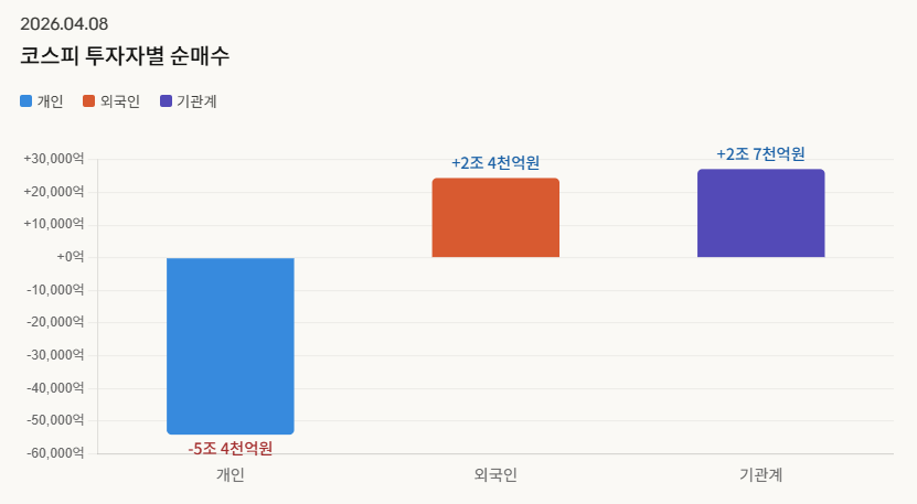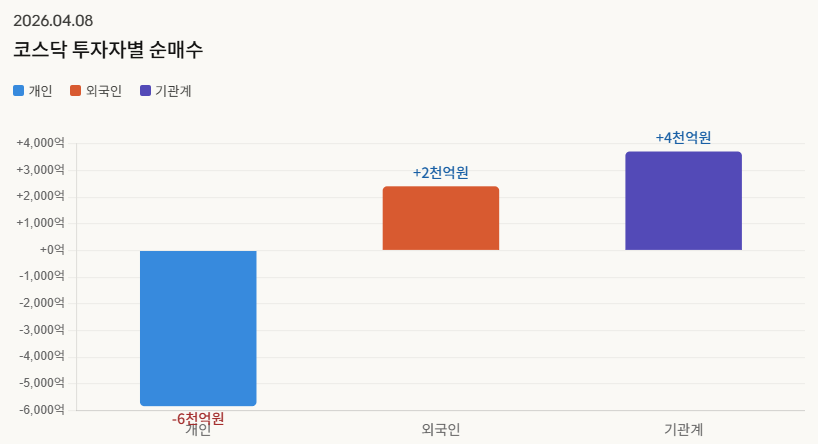 ์ฝ์คํผ 5,872.34(+6.87%), ์ฝ์ค๋ฅ 1,089.85(+5.12%)๋ก ์ ์์ฅ ๋ชจ๋ ๊ธ๋ฐ๋ฑํ๊ณ , ๊ฐ์ฅ ์งํ ๋๋ํ ๋งค์ ์ฌ์ด๋์นด๊ฐ ๋ฐ๋๋ ์ ๋๋ก ๋งค์์ธ๊ฐ ์ง์ค๋จ