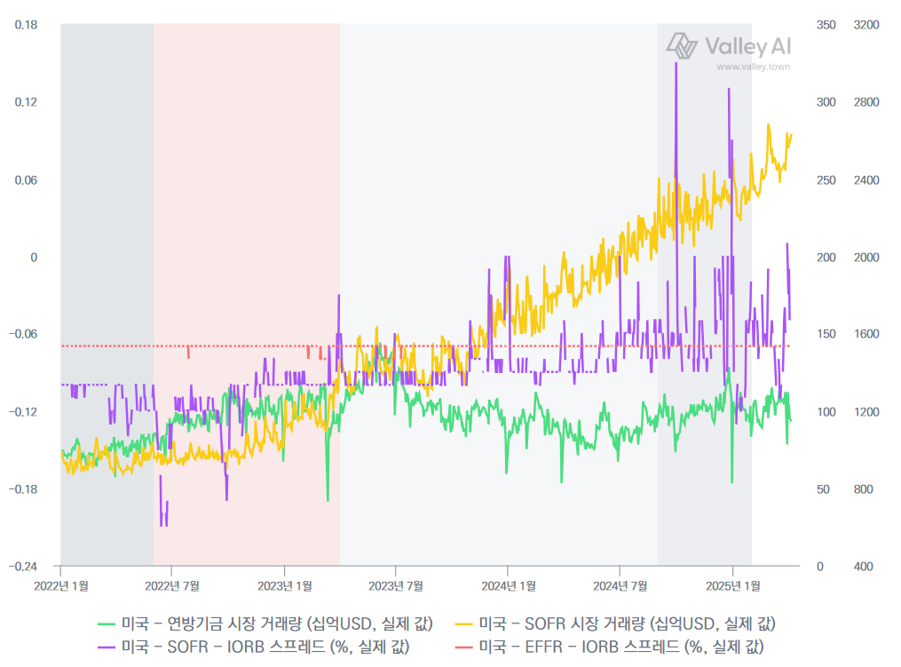 (SOFR이 EFFR보다 높아 단기자금시장에 유동성이 부족, 차트 출처: 벨리 플랫)