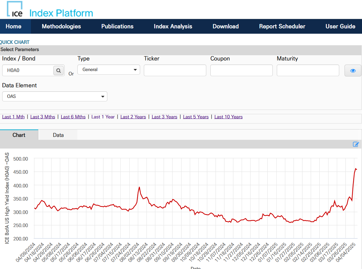 관세 충격으로 인한 경기 침체를 프라이싱 하듯 연말까지의 FFR 선물 시장을 더 많은 횟수의 인하를 프라이싱 하고 있고, 에널리스트들은 미국의 경제 성장률 전망치를 낮추고 있습니다. 크레딧 시장에서도 신용 스프레드가 벌어지며 경기 둔화 내지는 침체를 프라이싱 하고 있습니다. 대표적인 하이일드 채권 지수인 ICE BofA US HY의 경우 OAS가 400bps를 최근 넘어섰습니다.