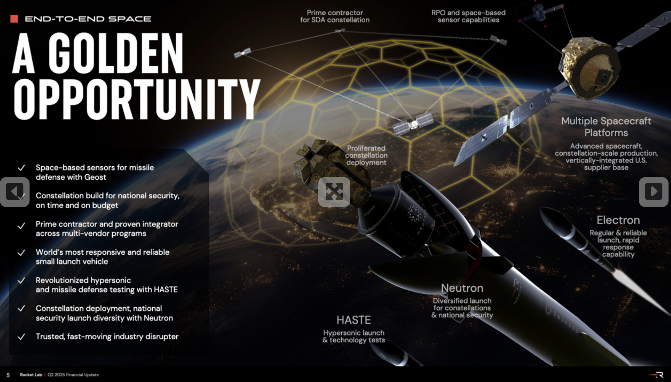 3. 발사 – 전술 시험·소형 위성은 Electron/HASTE, 대형 군사 별자리 배치는 Neutron으로 대응하는 그림을 제시. 콜에서 “프라임/서브/부품 공급사 어떤 형태로든 참여할 준비가 돼 있다”는 취지로 강조했습니다.
