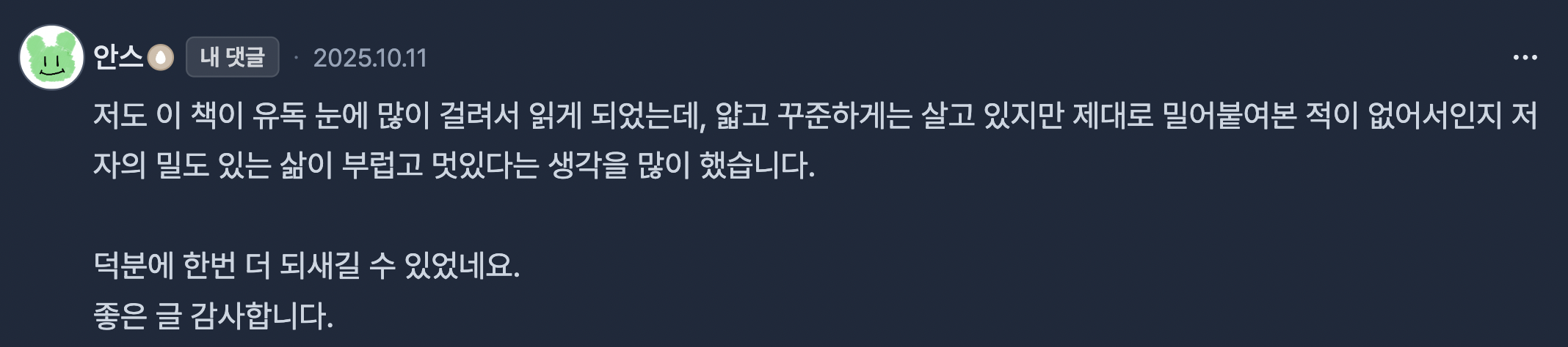처음에는 그저 감탄만 하며 읽었다면, 이번에는 이 질문을 품고 서평을 다시 읽어보았다.