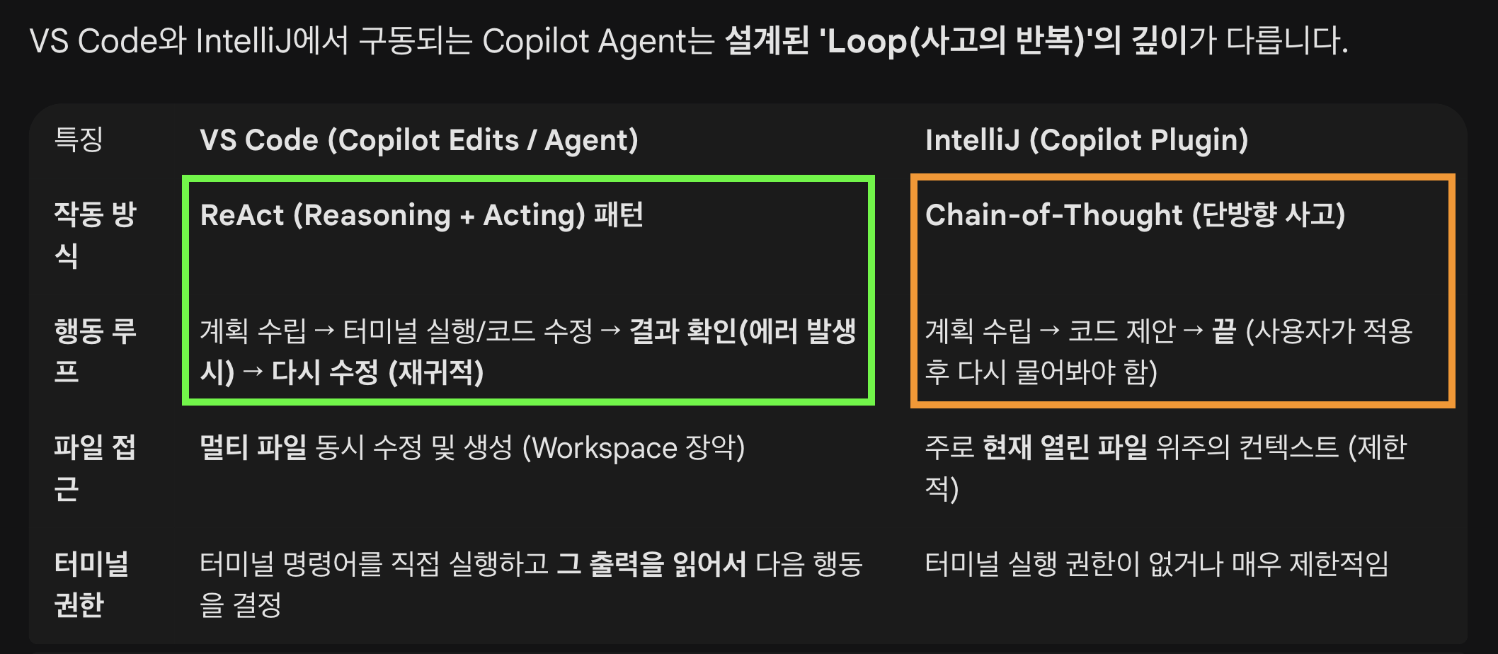 내가 체감한 두 도구의 가장 큰 차이는 'Agent 가 스스로 행동한 결과를 스스로 검토하고 개선하는 재귀적인 과정의 유무'였다.