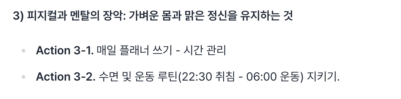 2주간 목표했던 3가지 중 세번째 '피지컬과 멘탈의 장악'은 지키지 못했다. 다만 처음으로 플래너를 2주동안 적었고 가장 기본인 루틴을 지키지 않았다는 것이 처음으로 확실하게 드러났다.