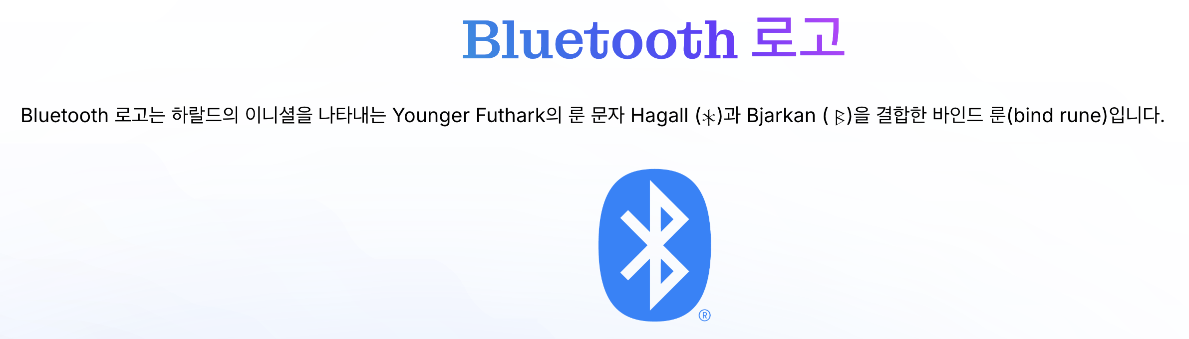 로고의 비밀: 블루투스 로고를 자세히 보시면, 알파벳 B가 아닙니다. 고대 게르만 룬(Rune) 문자로 H (ᚼ, Hagall)와 B (ᛒ, Bjarkan)를 합쳐놓은 모양입니다. (Harald Bluetooth의 이니셜)