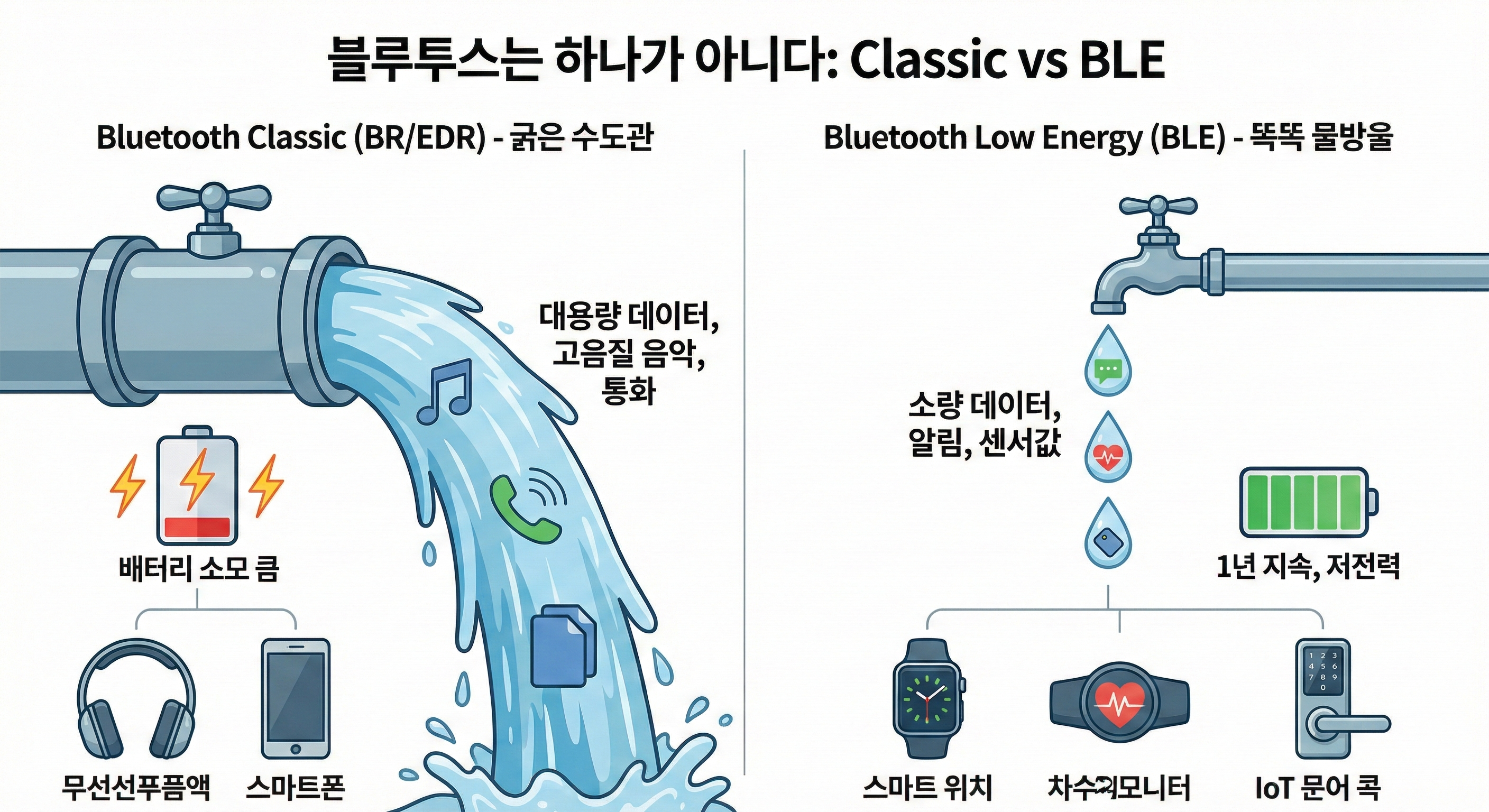 가장 먼저 이해해야 할 것은 "블루투스는 하나가 아니다"라는 사실입니다. 스마트폰 안에는 목적이 완전히 다른 두 개의 프로토콜이 공존합니다.