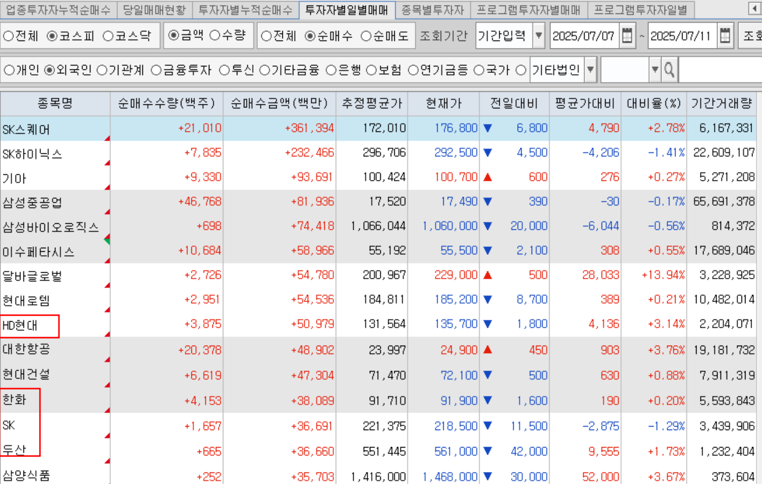 7/7~7/11 외인 수급 상위