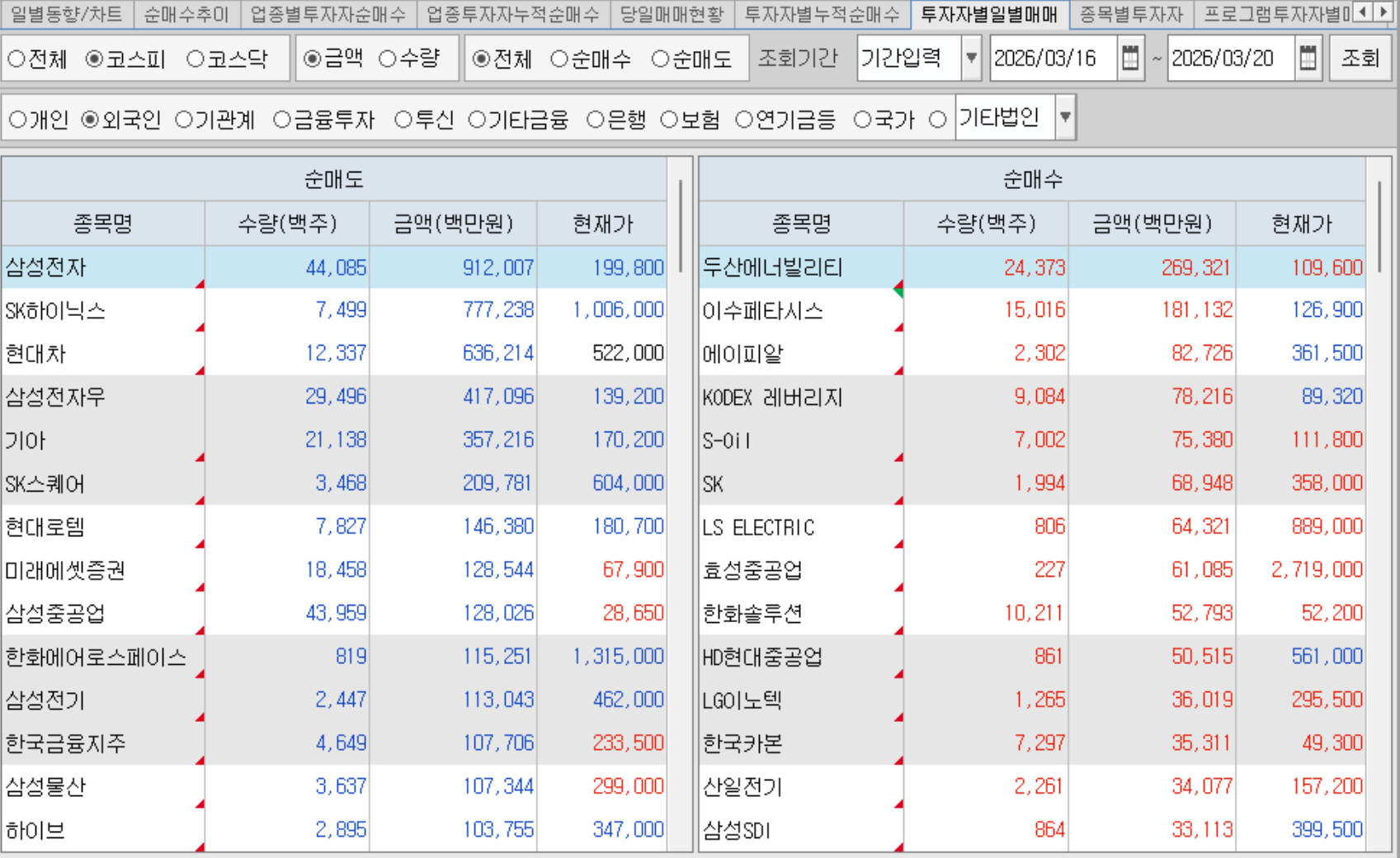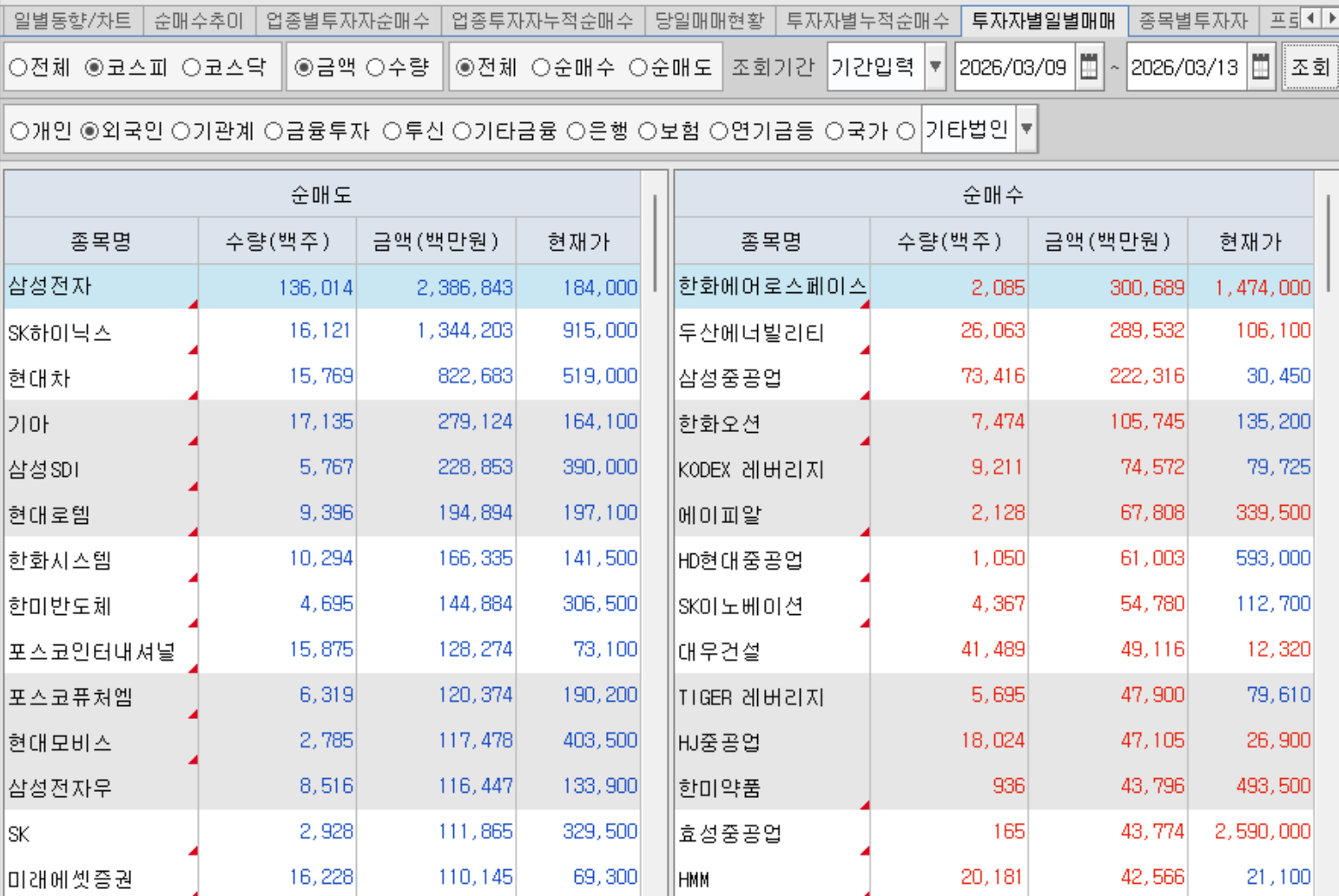 - 외국인과 개인이 5조9151억원, 1조3138억원을 각각 순매도, 기관은 5조1991억원...