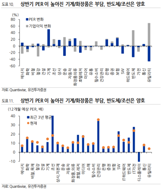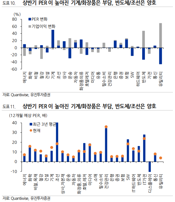 - 예컨대 기계/화장품 업종의 PER은 지난 3년 평균 수준을 넘어서 Valuation 부담이 높아진 것이기에