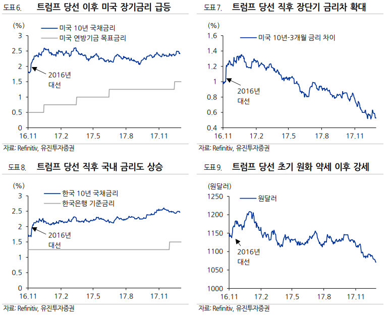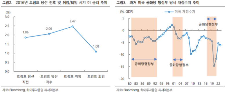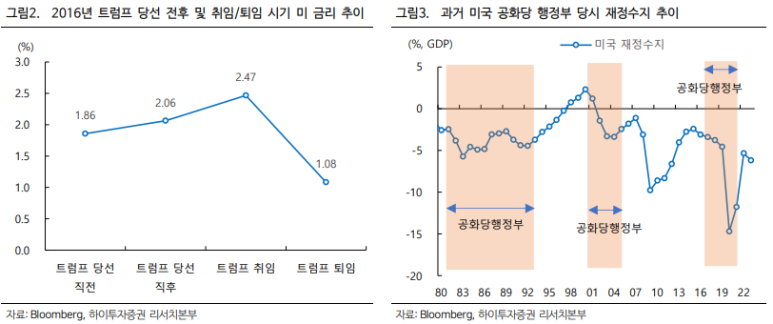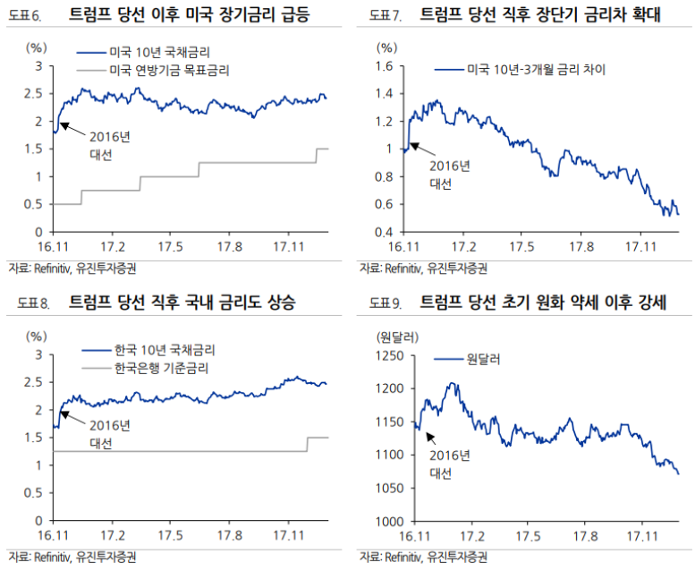 1)전통적으로 공화당 집권 시 확정적 재정정책이 동원되었다는 특성(트럼프의 감세정책과 인프라투자 확대 공약을 감안하면 미국의 국채발행 증가로 연결될 수 있음)