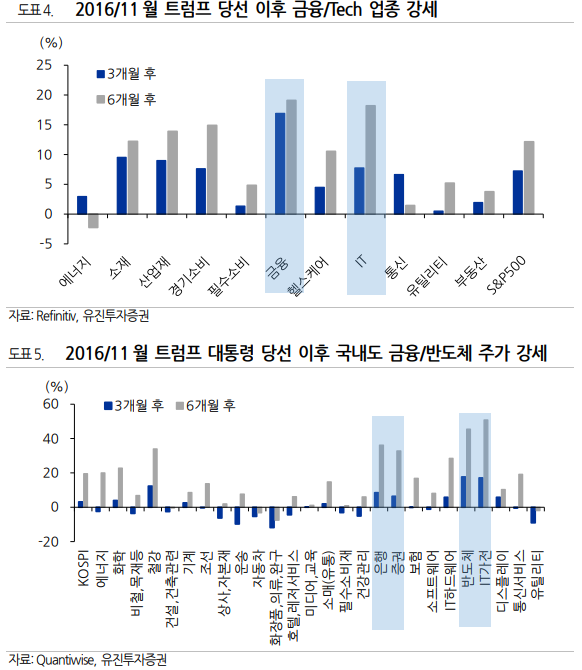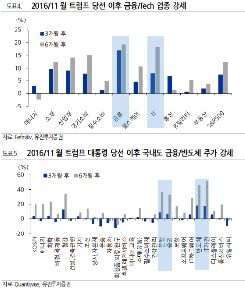 - 금융주와 Tech 주가 강세를 보였는데, 2016년 대선 3개월 후 미국 주요 섹터별 수익률을 보면 금융주가 가장 강했고, 3~6개월 동안에는 Tech 주가 강했음.
