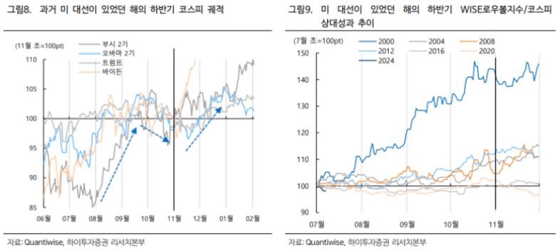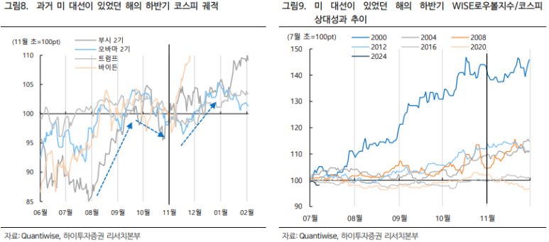 - 반면 과거 미 대선이 있었던 해의 코스피 궤적을 그려보면, 미 대선 선거운동이 본격적으로 시작되는 시기이자 이에 대한 리스크를 반영할 하반기에 대체로 성과가 양호.