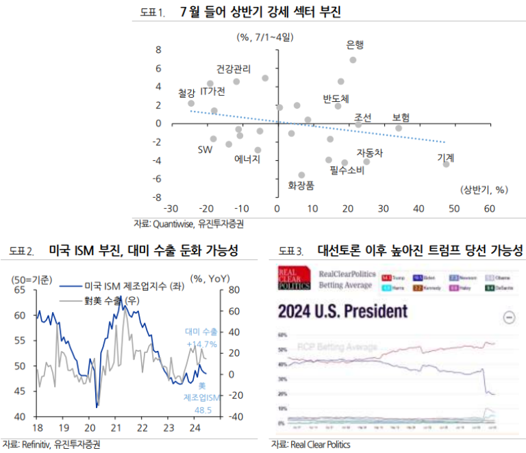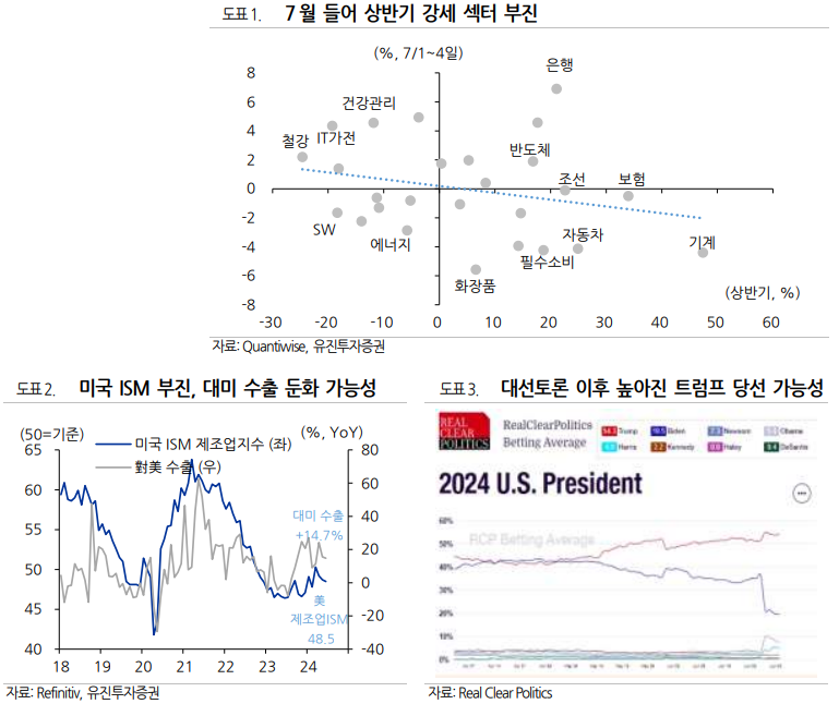- 상반기 동안 수출주에 대한 쏠림과 미국 1차 대선토론 이후 트럼프 전 대통령이 재선될 가능성이 높아진 점이 영향을 미쳤을 것으로 추정.