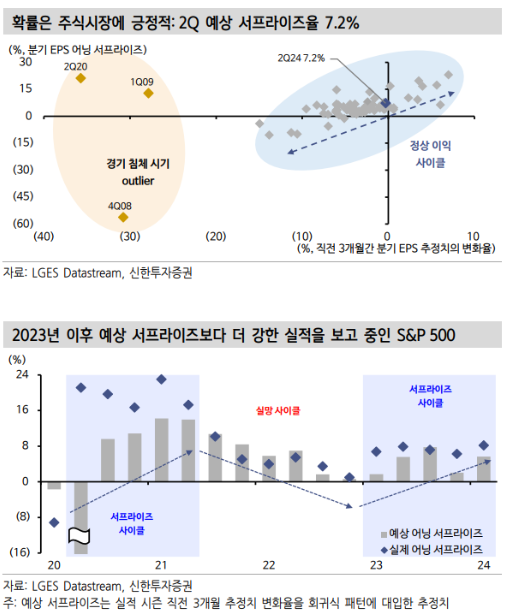 - 과거 패턴에 대입할 경우 7% 수준의 서프라이즈를 기대할 수 있는데, 작년부터 S&P 500은 예상 수치보다 1% 이상 서프라이즈를 더 내는 서프라이즈 사이클에 있음. (8% 수준까지도 기대 가능)