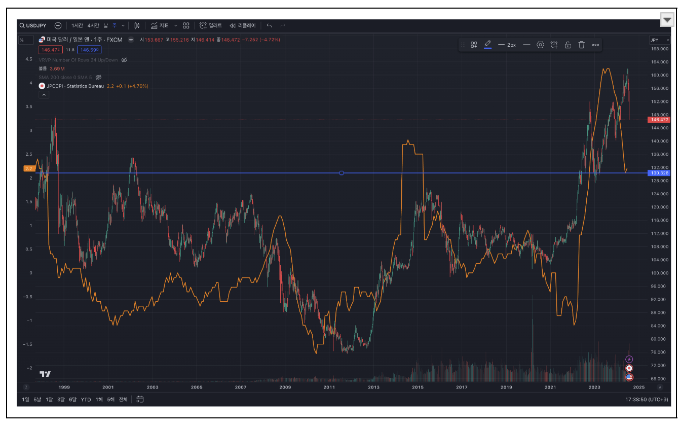 엔화와 일본 Core CPI 를 보면 130부근에서 크게 인플레가 발생하지 않았음