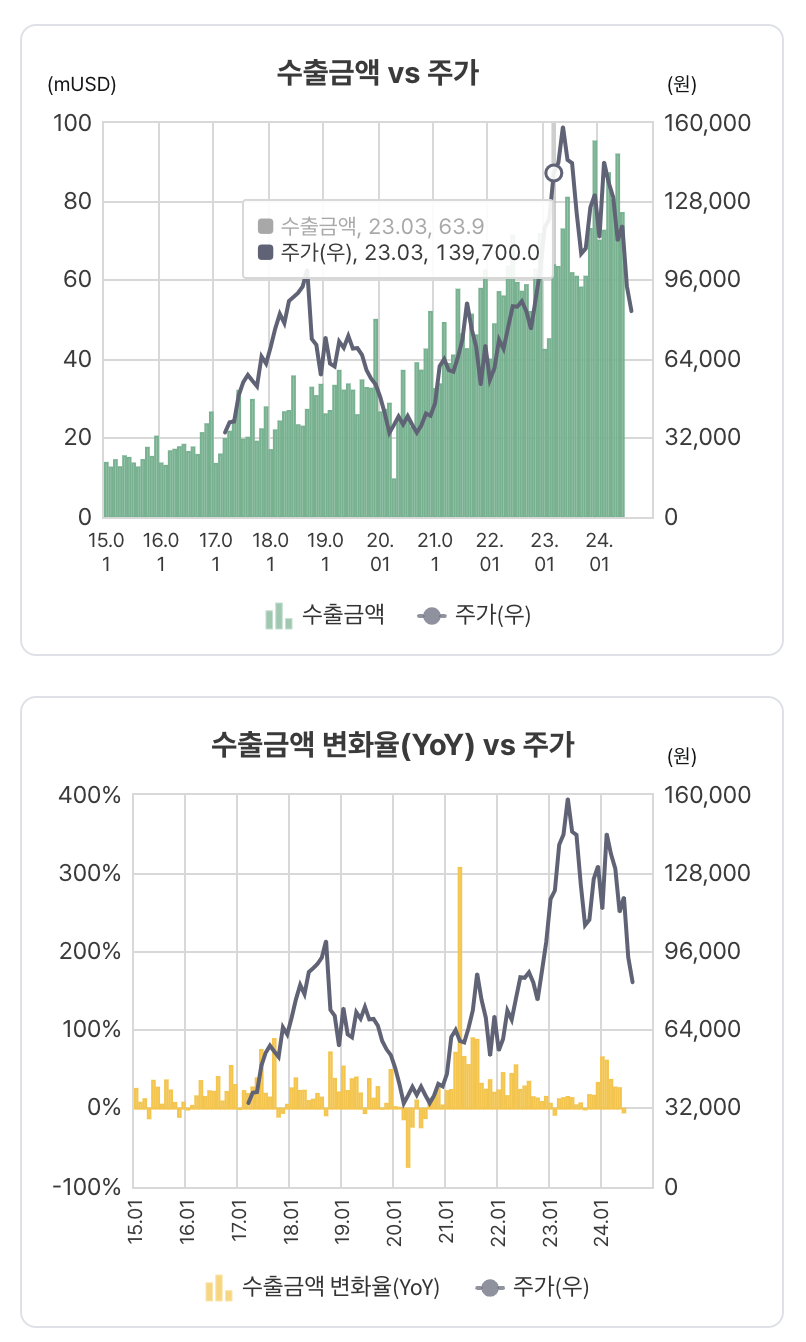 수출금액 변화율과 주가는 유사하게 움직임...중국으로의 수출이 매출에 52%니까 쉽게 설명이됨
