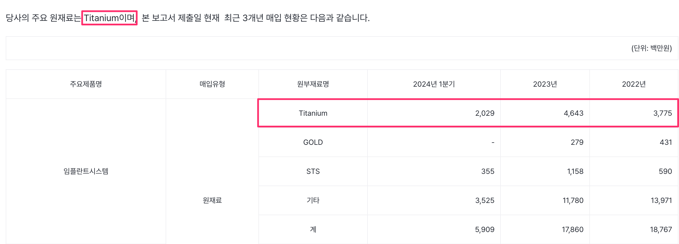 당사의 원재료 및 부재료는 제품 특성상, 단일 품목으로는 Titanium의 비중이 가장 높으나, 대부분이 여러 다량 품목으로 구성되어 있습니다. 따라서, 단일 품목의 시세 변화에 따라 전체적인 원재료비가 받는 영향은 상대적으로 낮다고 볼 수 있으며, 각 개별 품목별로 발주량이나 시기 등이 연도별 단가 차이를 가져 올 수 있습니다. 상기 주원재료의 가격 변동 원인을 요약 기술하면 다음과 같습니다. → 임플란트를 만들때 정확한 티타늄 비중은 없음