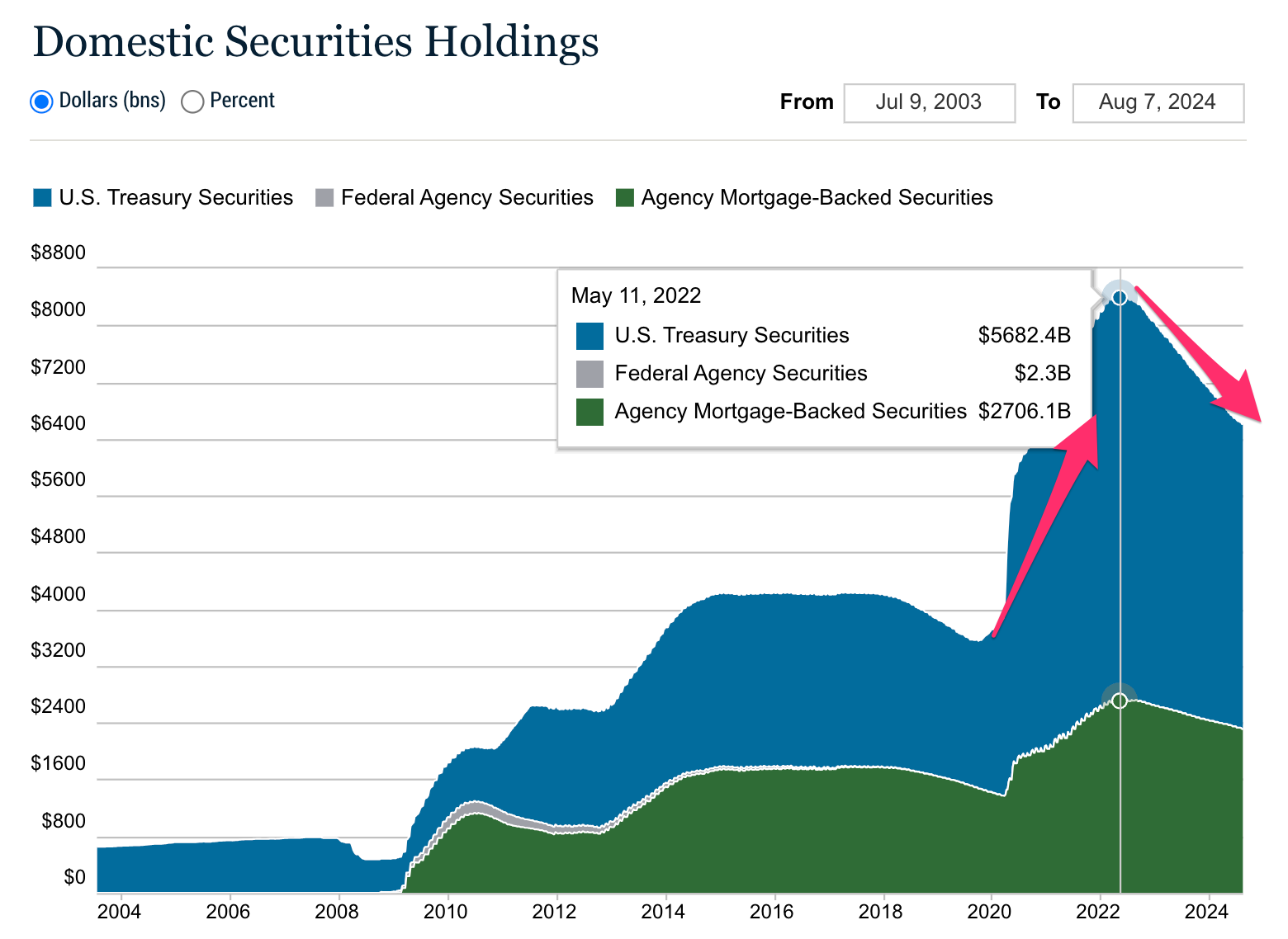 SOMA 계정을 시각화 해보면 국채와 MBS로 나눠서 볼 수 있으며 1) 첫번째 화살표 동안 QE를 진행하며 유동성 공급(국채를 매수) 2) 두번째 화살펴 동안 QT를 진행하며 유동성 회수(보유 국채에 대해 롤오버 하지 않음)