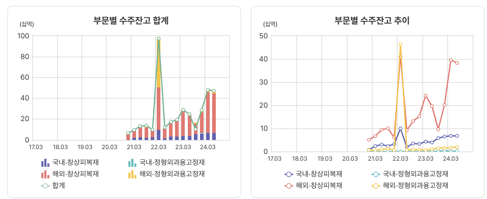 "해외-창상피복재" 수주잔고 합계 비율이 국내보다 높은 것을 알 수 있음