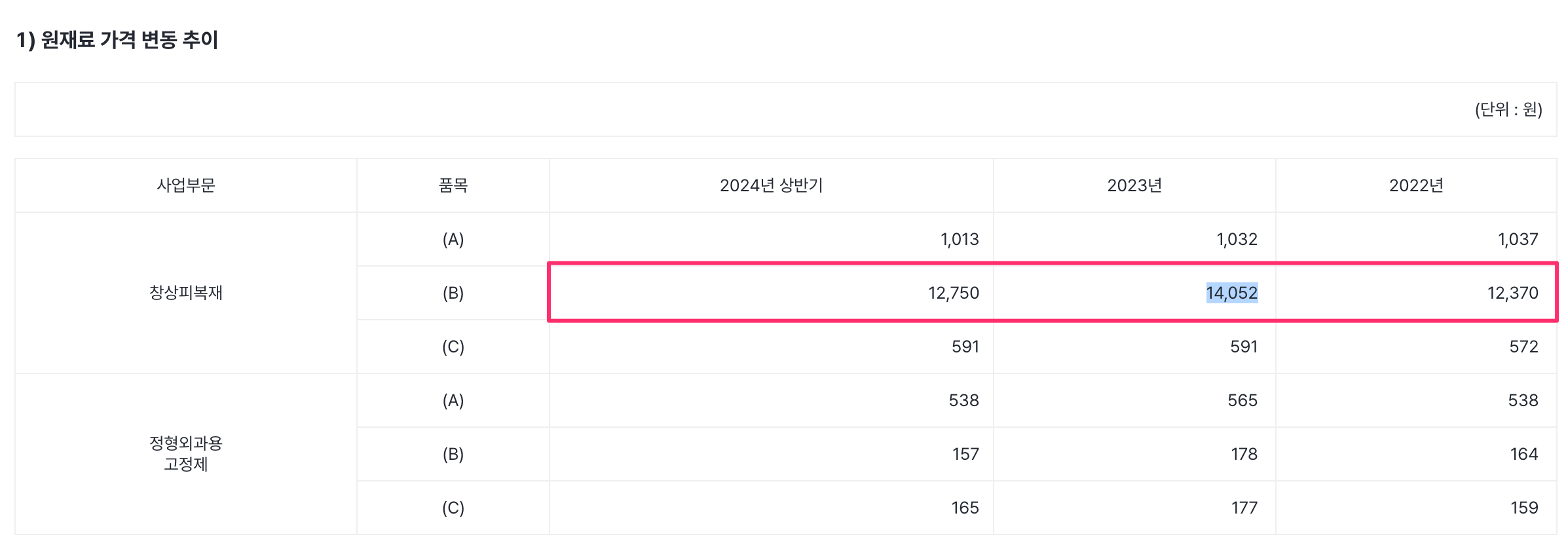 원자재 가격 변동 추이를 보면 주요 매출을 이끄는 창상피복재의 (B) 제품의 경우 23년도 일시적으로 가격이 13.5% 상승하였으나 24년도 가격이 22년도 수준으로 하락하였음