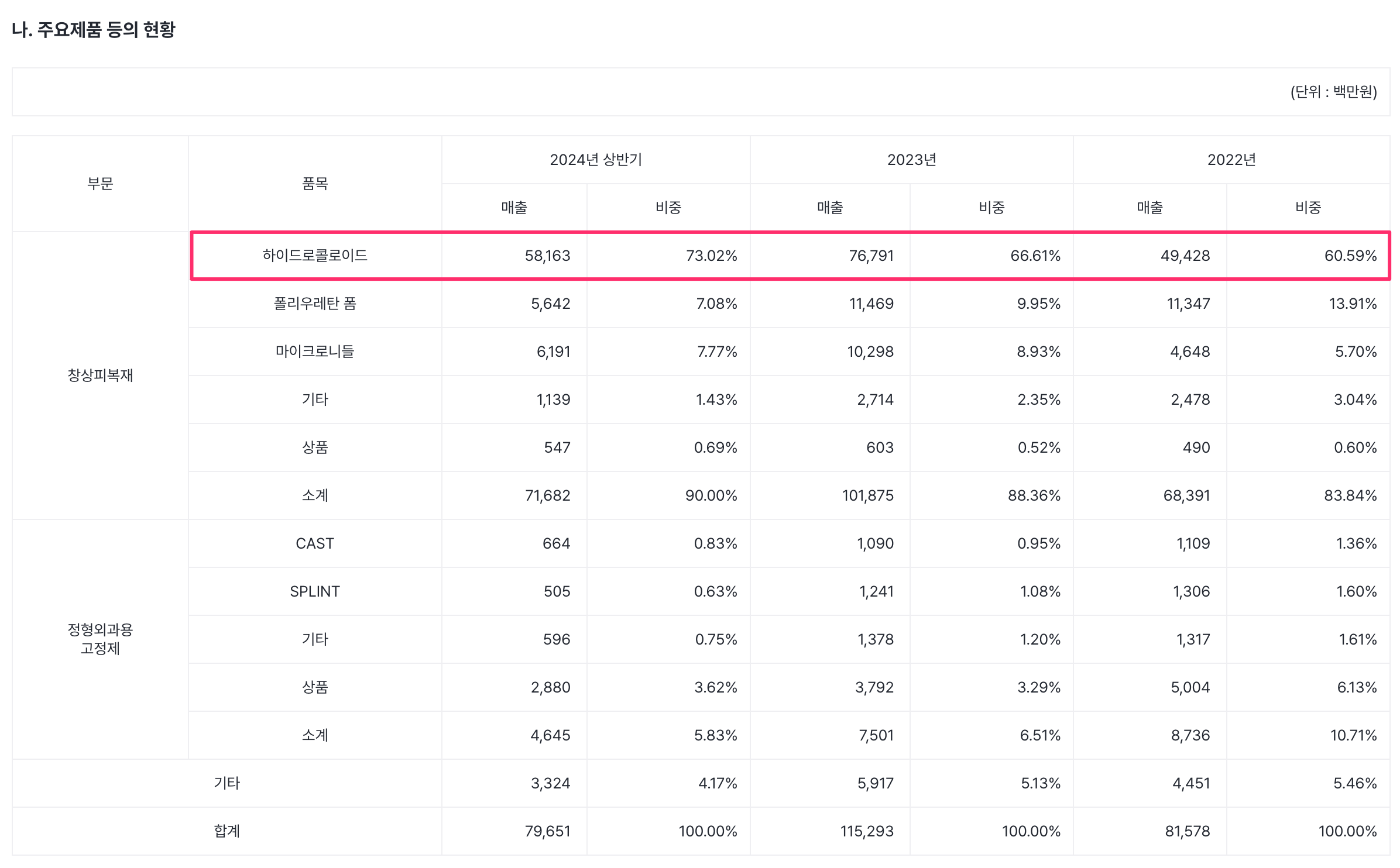 하이드로콜로이드가 무엇인지 모르겠지만 이것이 핵심 매출원인가 봅니다.