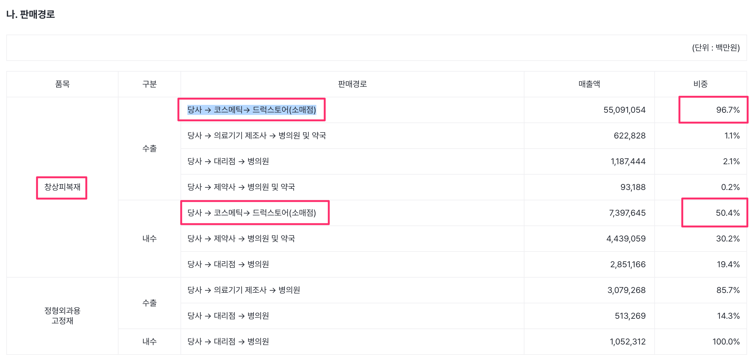 비중 높은 제품의 판매 경로를 보면 "드럭스토어(소매점)"의 역할이 중요하며 유통망이 중요함을 확인할 수 있음